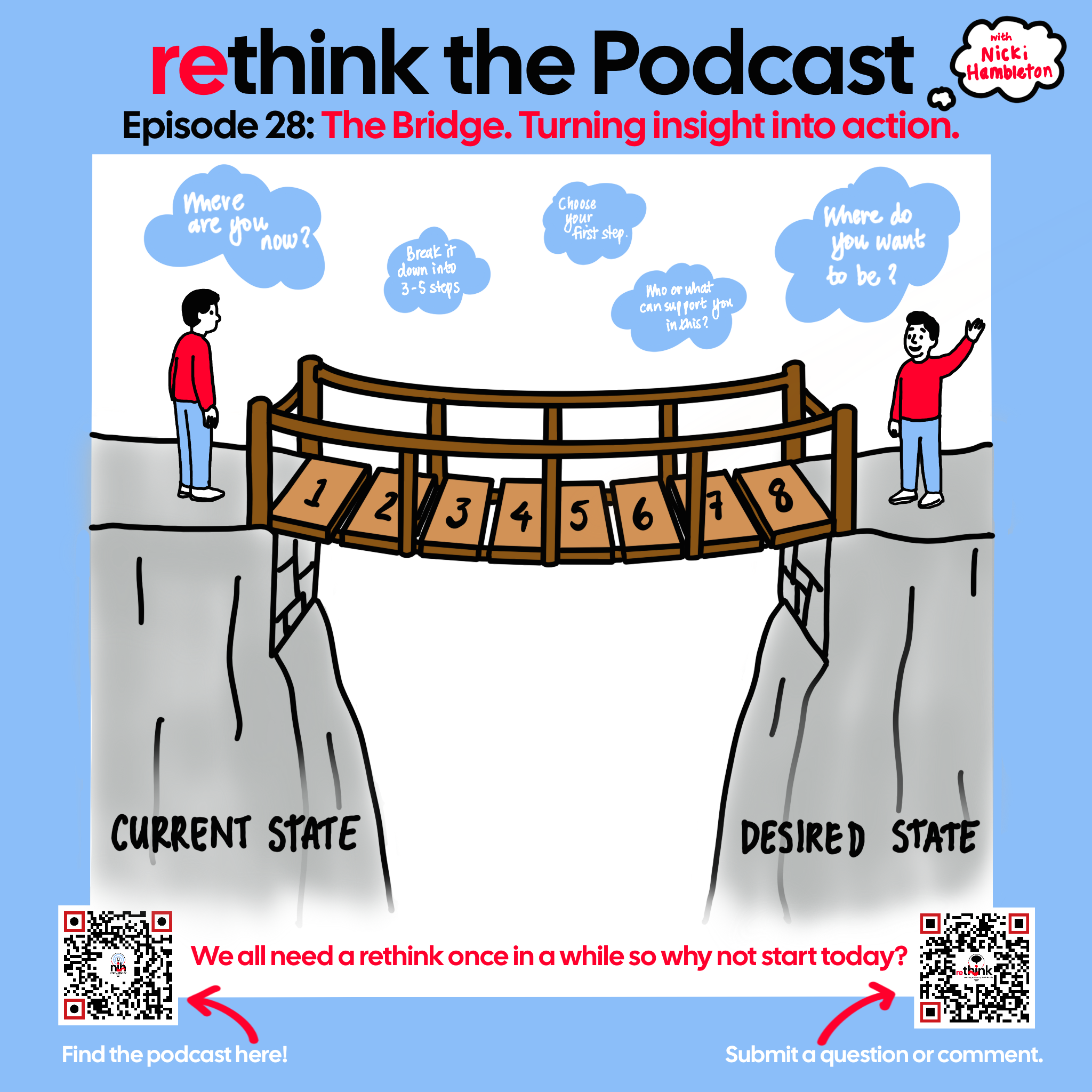 In this episode of rethink: the podcast, Nicki Hambleton introduces the Bridge Framework: a visual strategy to help you move from insight to action. Whether you’re feeling stuck, overwhelmed, or standing at the edge of something new, this simple tool will help you break things down, find your route and take your next small step.