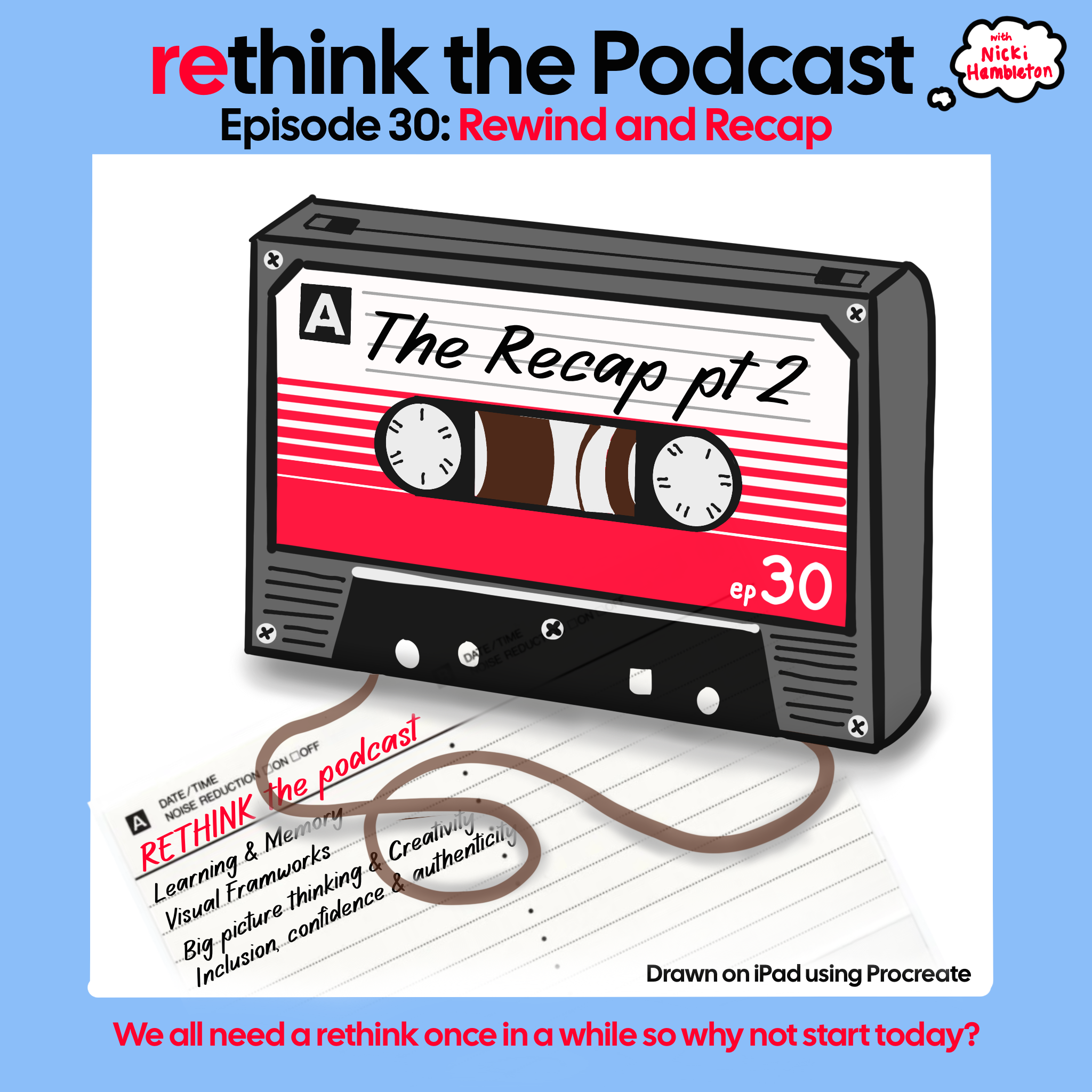In this recap episode of Rethink: the podcast, host Nicki Hambleton reflects on 30 episodes and seven months of recording. She highlights four major themes—learning & memory, visual frameworks, big picture creativity, and inclusion & authenticity, while sharing key insights and thanking guests Nici Foote, Paul Vincent, and Brendon O’Brien. The episode looks back at lessons learned and ahead to future topics, including authenticity and new guest conversations.
